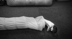Он лежит, запрокинув голову назад и выгнув спину. В такой позе невозможна даже та активность, которая вообще-то возможна лежа. В такой позе трудно глотать и даже сфокусировать взгляд трудно. Такая поза опасна, потому что от нее грудная клетка становится плоской и развивается пневмония. Руки ребенка, лежащего в такой позе, как правило напряжены и прижаты к груди. Ничего нельзя сделать такими спазмированными руками, никаких осознанных движений. Ноги ребенка, находящегося в такой позе, как правило, не лежат ровно, а обычно перекрещены, и колени как будто снесены в сторону. Это тоже опасное положение. Рано или поздно оно приведет к вывиху тазобедренных суставов.
