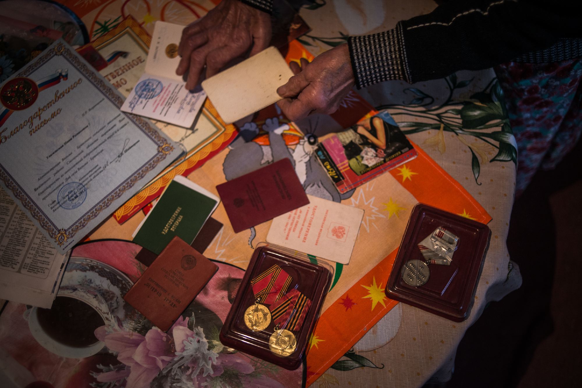 В доме на Рабочей улице горит свет. Нина Романова ждет нас уже с утра. Рядом с ней спит ее кот, а безработный сын как всегда не дома. В просторной комнате чувствуется одиночество. Около небольшой искусственной елки фотографии маленьких внуков, которые уже давно выросли. «Вот этому комоду уже шестьдесят, дитятки, его еще мой дедушка делал, но его уже двенадцать лет как нет», — Нина Романовна ведет нас к круглому столу, на котором лежат ее награды и медали, завернутые в оторванную обложку детектива Дарьи Донцовой.