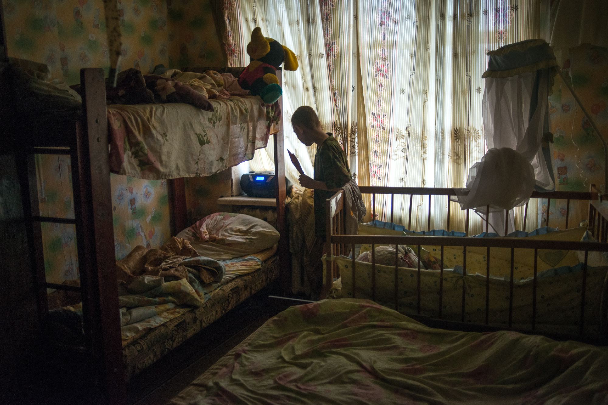 На заплывшей жиром газовой плите постоянно горят две конфорки. Раскаленная решетка светится оранжевым огоньком: «Дети дома бегают целый день, а батареи холодные. Как на улице потеплеет, у нас сразу зябко, поэтому мы так топим». От перепада температур в квартире очень влажно, уголки фотообоев отклеиваются от стен. «Никита, не бесись», — Сергей тушит окурок и поглядывает на своего сына, который носится по кухне с большой красной звездой для новогодней елки.
