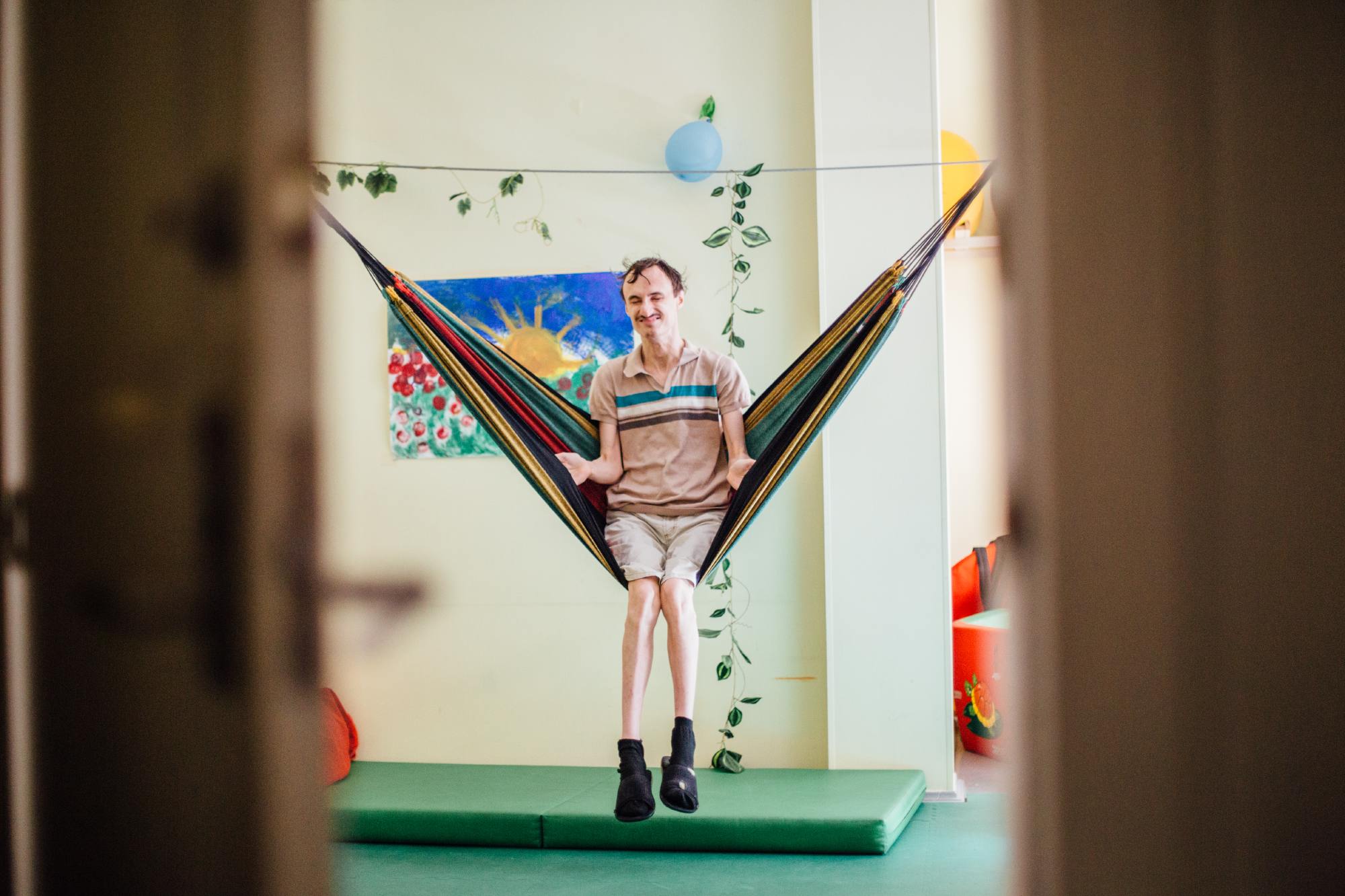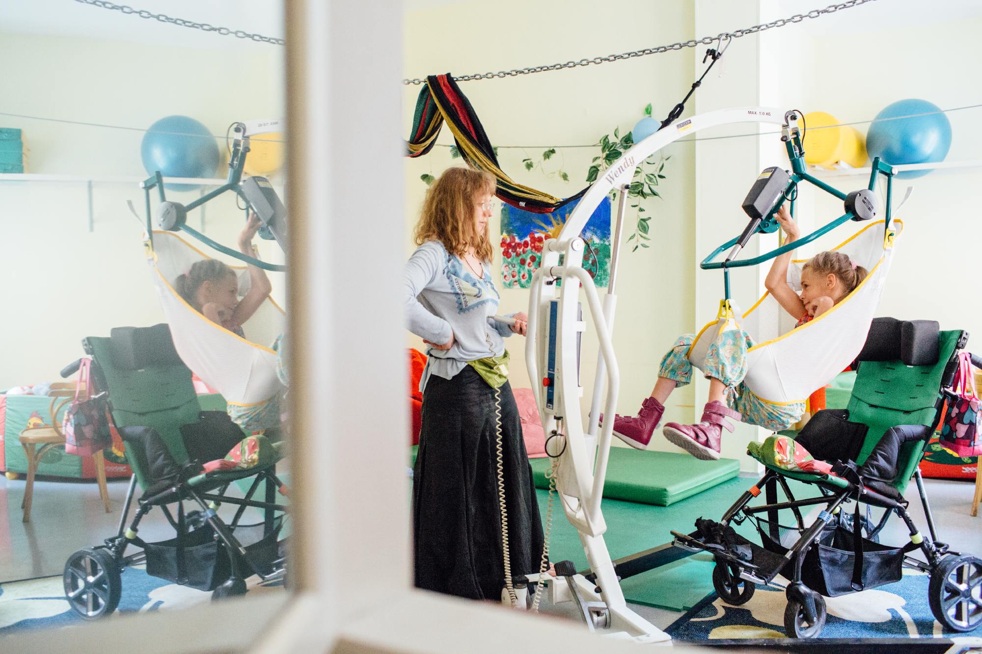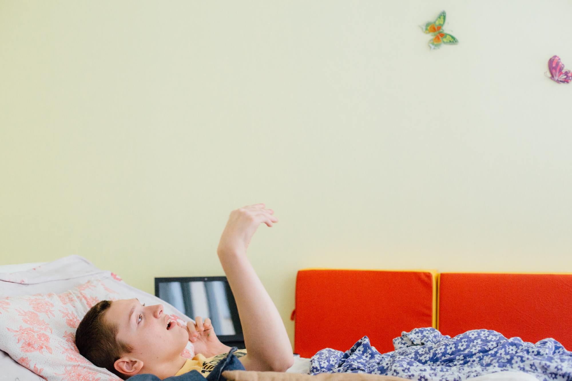 «Я заметила, что если таких тяжелых не отдают в детские дома, то тогда их очень-очень любят», — рассказывает социальный работник Маша. Одновременно она дает лекарство своему подопечному Владу, который лежит на кровати и делает вид, что хочет Машу укусить.