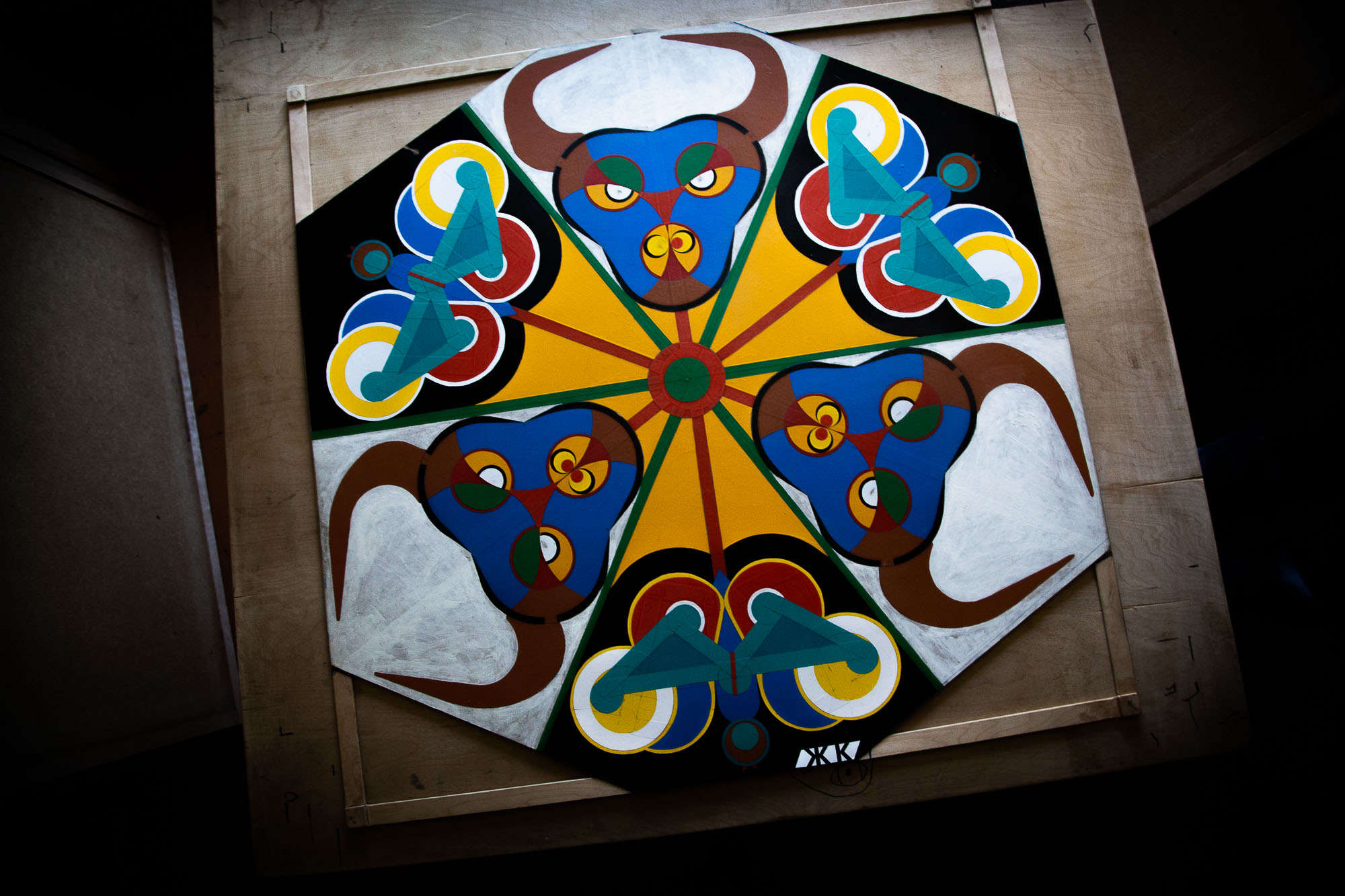 К символам со временем прибавилась и философия цвета: красный цвет — мужское начало, а синий — женское. Прямоугольник символизирует мужчину, треугольник — женщину. А круг — ребенка. В первой же работе Евгений соединил все эти символы между собой и назвал соответствующе — «Повозка семьи».