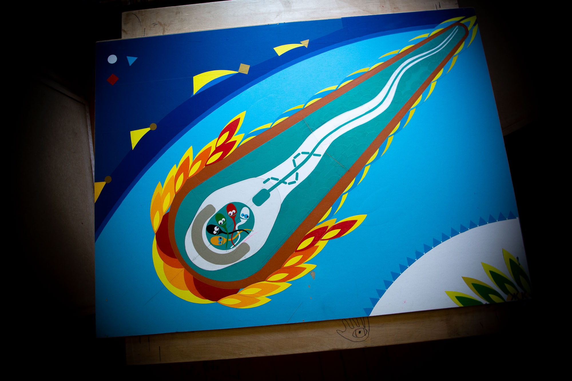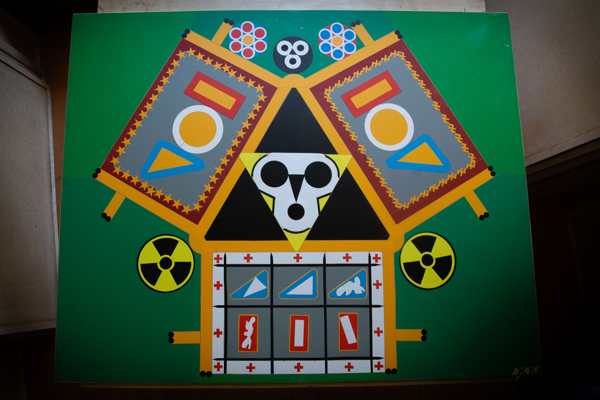 Над первыми картинами работал гуашью, но почти сразу придумал вырезать фигуры из цветной самоклеящейся пленки. Это и помогло продолжить работу, даже когда начал подводить второй глаз. Художник выполнял рекомендации врачей, капал капли, принимал лекарства — пытался спасти зрение до последнего.