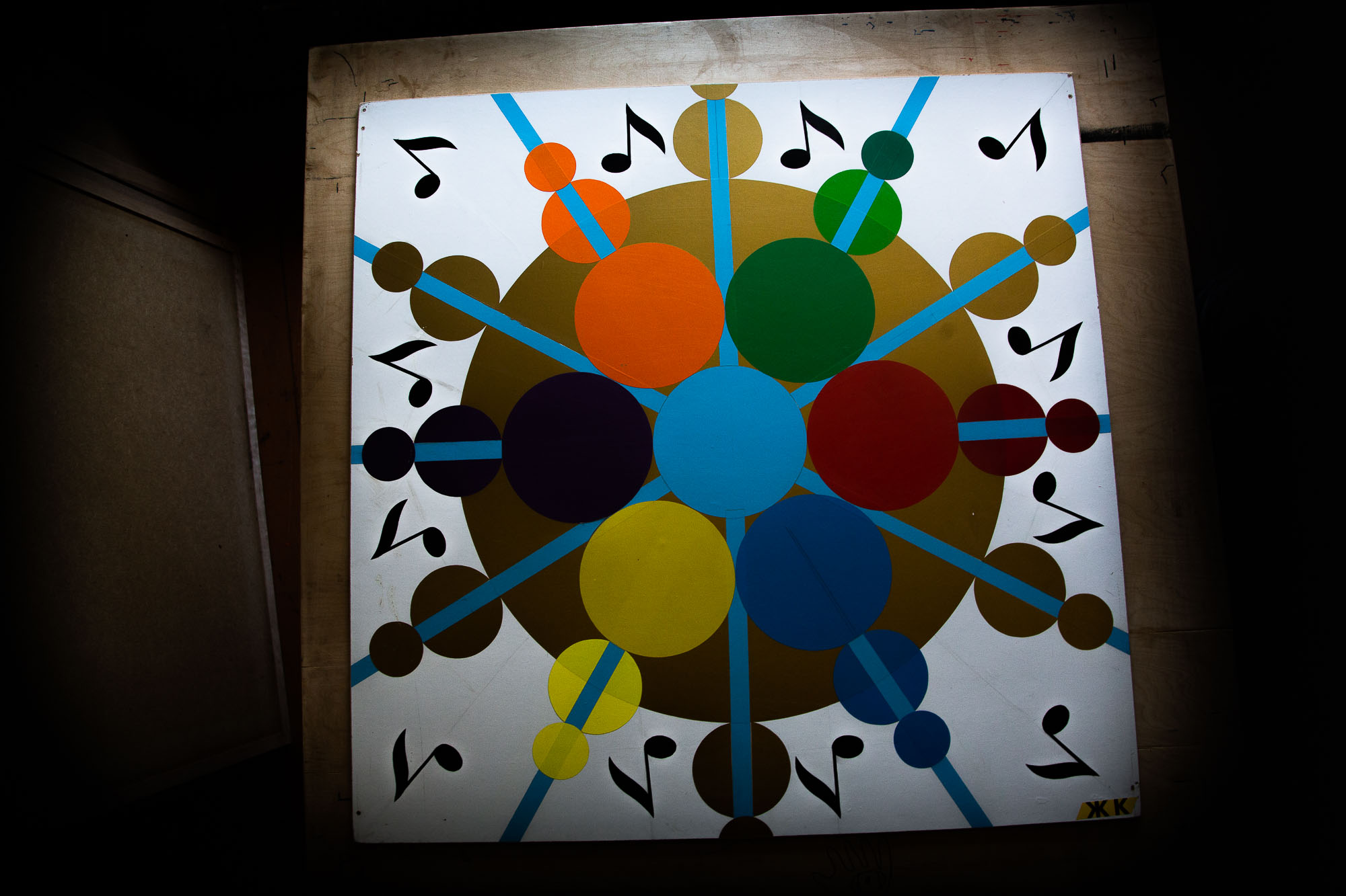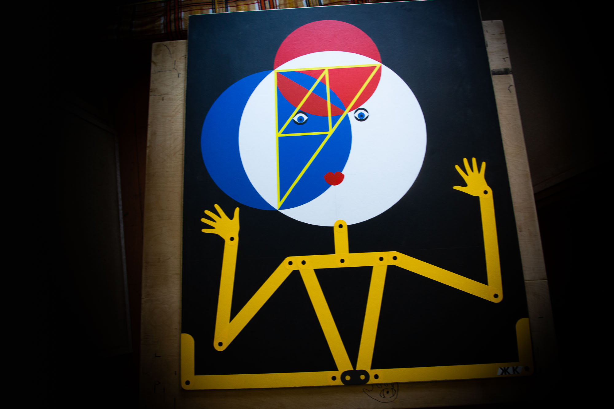 Почти все пространство комнаты-мастерской занимает большой стол. К двум свободным от дивана и шкафа стенам прислонены картины, некоторые высотой в человеческий рост. На столе ярким пятном — еще стопка работ. У стола стоит их автор, 79-летний Евгений Костылев — в джинсах, черной толстовке, трикотажной шапочке и круглых черных очках. Мы перелистываем одну за другой, на всех замысловатым образом переплетены геометрические фигуры: белые и черные круги, красные прямоугольники, желтые треугольники, обведенные синим.