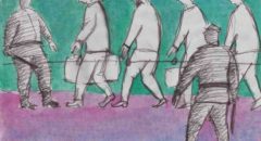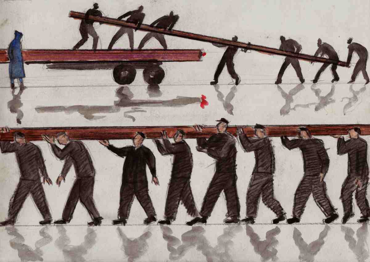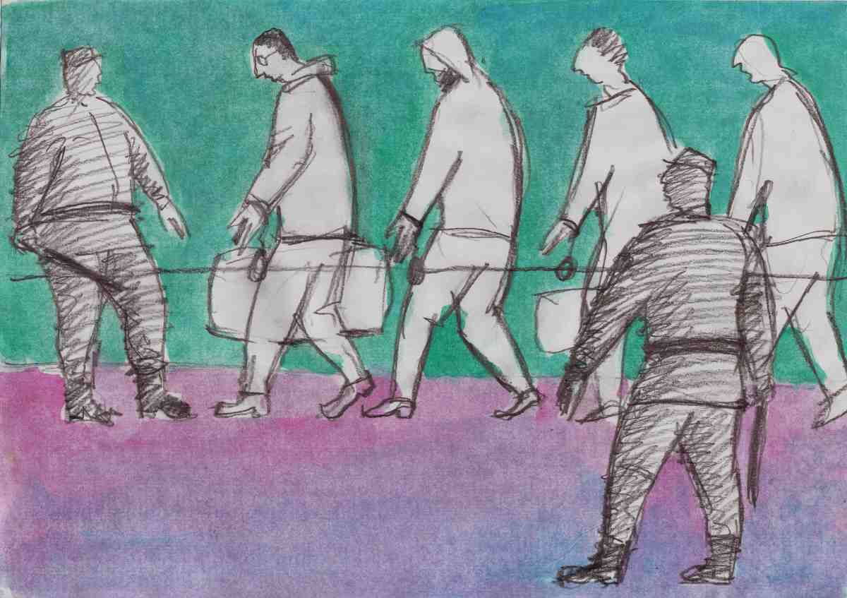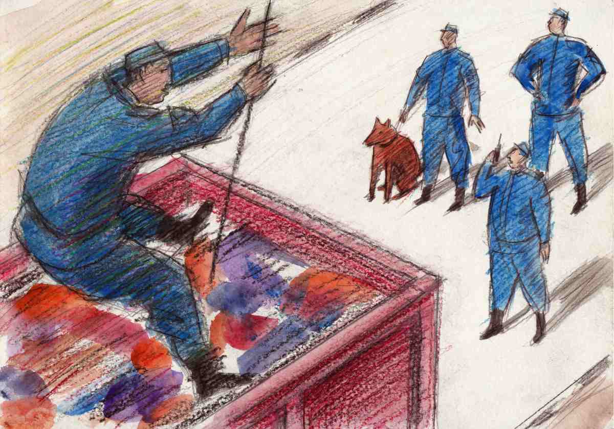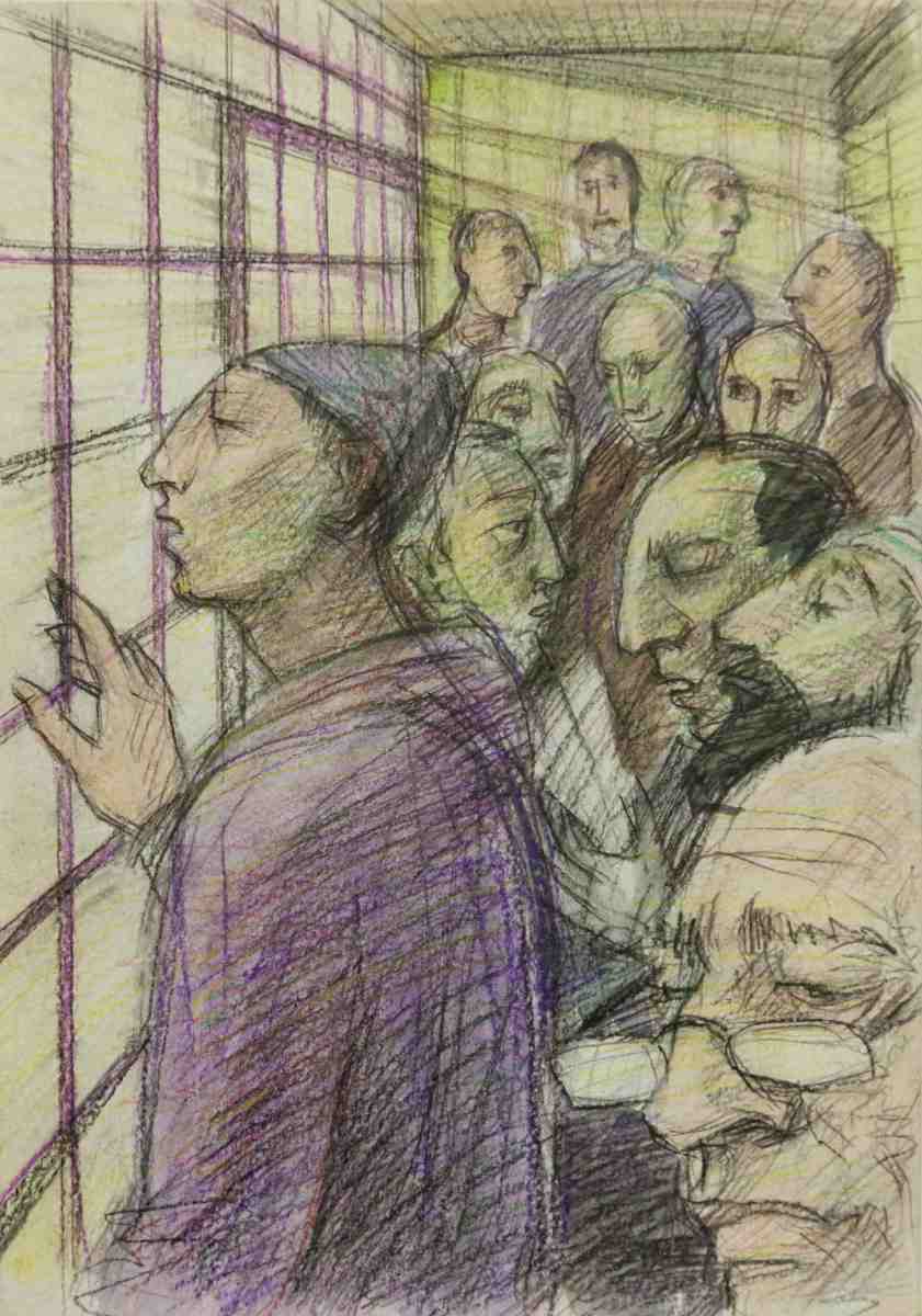 К счастью, я оставил с собой тетради с записями. По правилам все запрещено: краски, кисти, карандаши, маркеры. На первом обыске, еще перед отправкой в автозак, меня спросили: «Есть запрещенное?» Я честно ответил. Но все пропустили. В поезде, а обыски происходят на каждом этапе, вообще комично получилось. Нашли краски и кисти: «Ты художник? Нам нужна стенгазета в вагон. Нарисуй, пожалуйста, как наш поезд идет из Москвы через Тамбов в Астрахань». Поезд ехал, а я рисовал едущий поезд. Конвоиры были счастливы: принесли нам таз гречневой каши с тушенкой.