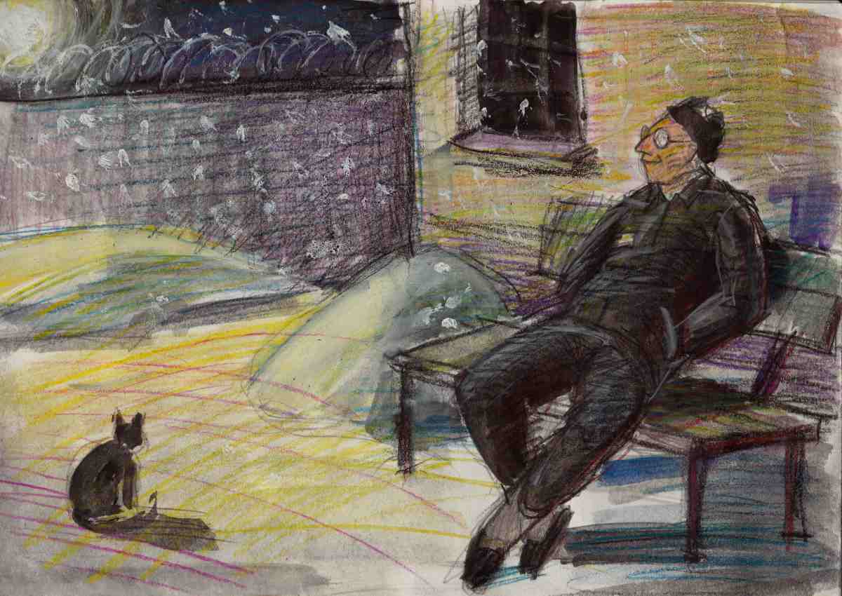 Через полгода мне дали должность ночного кладовщика. Построения, быт проходили мимо, я выдохнул. Склад был практически моим личным пространством. Нужно было просто выдавать довольствие: вещи, матрас, белье, посуду. Это занимало час-полтора в день. Всю ночь я был предоставлен сам себе: читал книги, которые не пропустили через приемник, слушал рок-радио. Получил передачу с акварелью и масляной пастелью и стал активно продолжать серию про самое начало: электричку, первые допросы, автозак, душ, карантин. Но на складе я пробыл недолго: слишком активно общался с арестантами. Помня свои опыт и эмоции первых дней, я старался их как-то поддерживать, успокаивать, предлагал чай и угощал своим запасом галет.