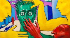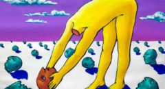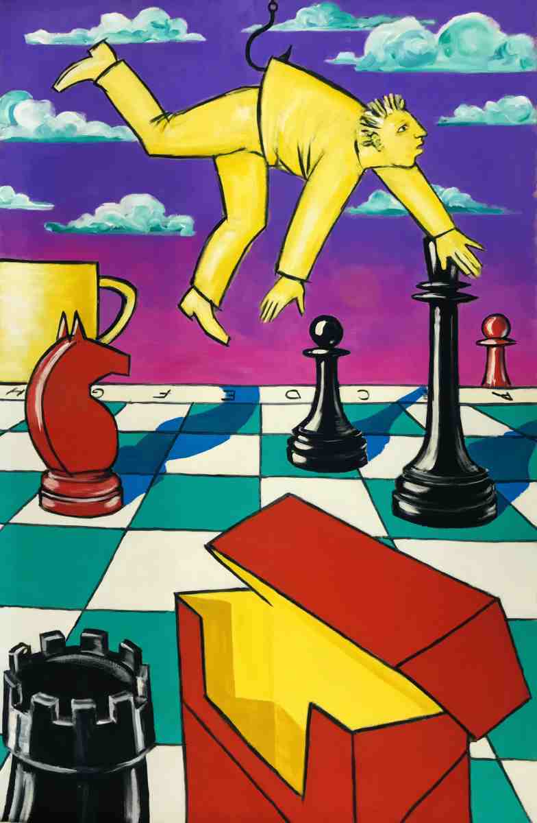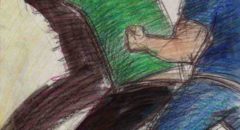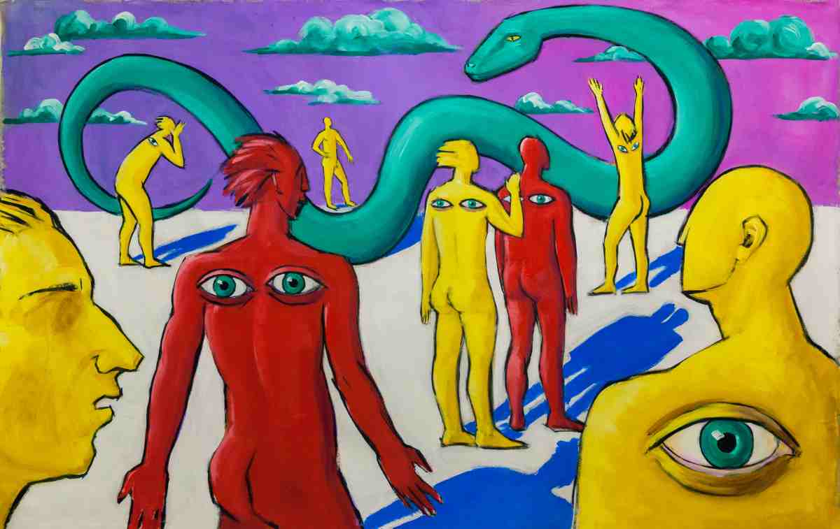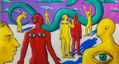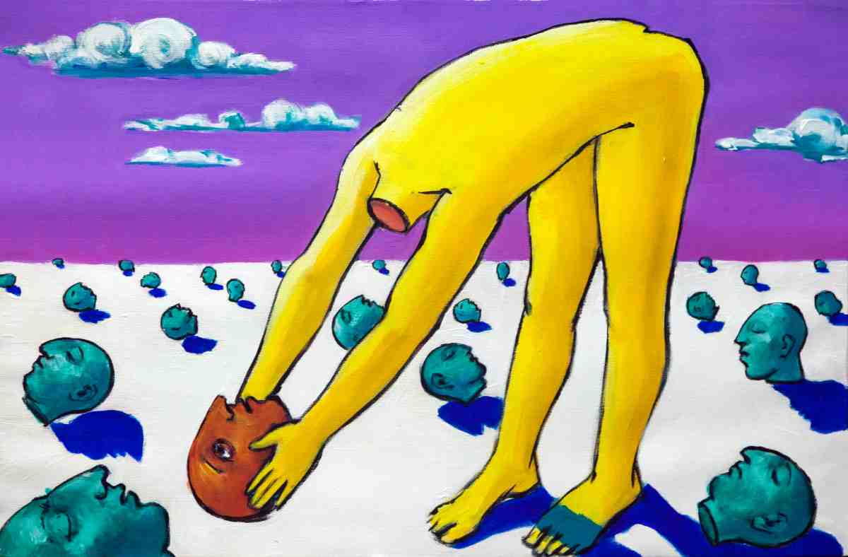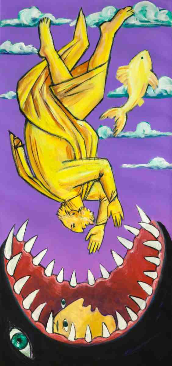Получилась серия из шести полотен 1,14*1,8 метра. На одном пророк Иона падает с неба в пасть кита, рождая маленькую рыбку. Он падает в ад, но дает надежду на спасение. Полотно о кентаврах о свободе: приснились высота, Крым, горы, небо и я, быстро несущийся вперед. В принципе, это набор визуальных символов, запомнившихся после снов.