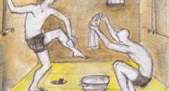 Я вижу абсолютно не романтичную тюремную субкультуру: веревочные дороги, по которым передают носочки с посылками, энтузиастов криминального образа жизни. Среди них есть как довольно неприятные люди, так и вполне достойные. Я в глубочайшей депрессии: мой мир и тюрьма в сознании несовместимы. Не понимаю, почему я в тюрьме за то, что я купил для самого себя за заработанные деньги. Не рисую, хоть карандаши теперь и есть. Лежу, отвернувшись к стенке, в своем мраке. Мне помогает чеченец Лечи, смотрящий.