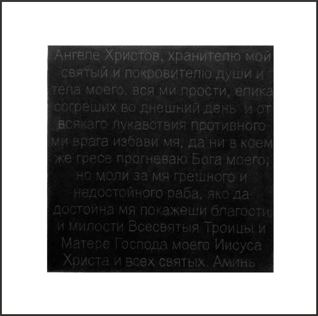 В самом начале проекта организаторы предложили написать картину известному красноярскому художнику Василию Слонову. Тот принес полотно в стиле Казимира Малевича — черный квадрат, в центре слова молитвы. От эпатажного и ироничного живописца не ожидали чего-то иного. Со временем, учитывая все, что произошло и происходит в мире, стало ясно, что работа Слонова органично ложится в концепцию проекта. Это молитва за всех своему ангелу-хранителю.