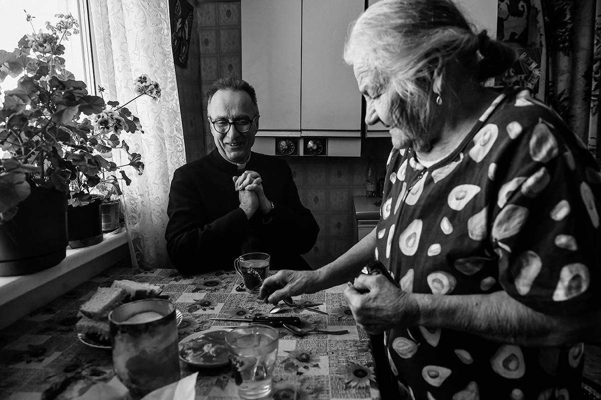 86-летняя Моника Александровна Фот ждала приезда отца Дитмара в ее деревню Половинное несколько месяцев. А может, и дольше — она считает, что священник не заглядывал к ней уже целый год. Возможно, потому, что время здесь, в крохотной деревне, где ничего не происходит, тянется особенно медленно.