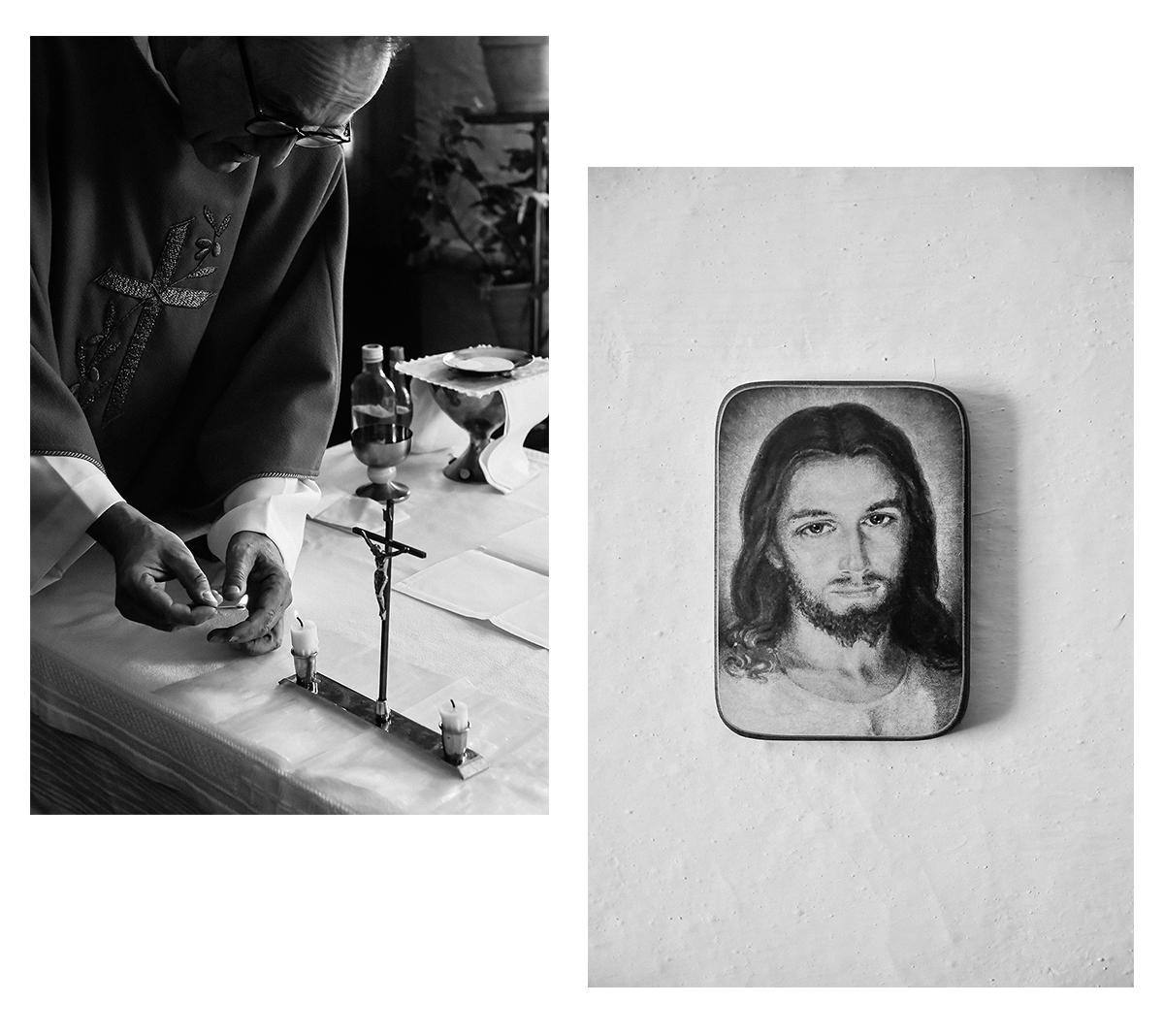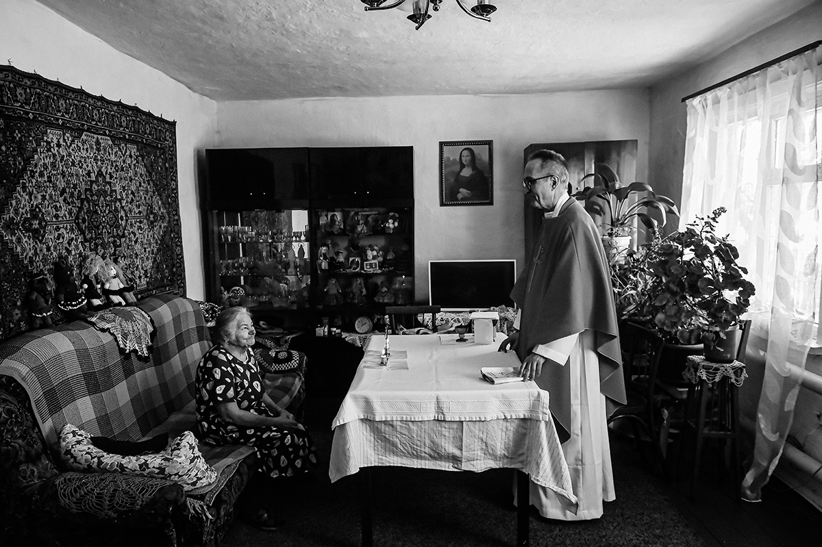 Он тоже приехал не с пустыми руками. В чемоданчике — портативный набор для причастия, на плечиках — лиловое облачение. Все для того, чтобы исповедовать Монику Александровну и провести Святую мессу — литургию, которую обычно совершают в храме. Но прихожанка уже давно не покидает деревню Половинное.
