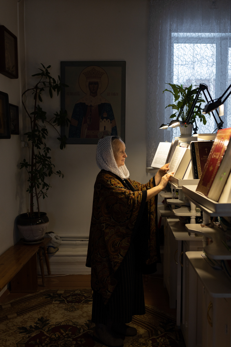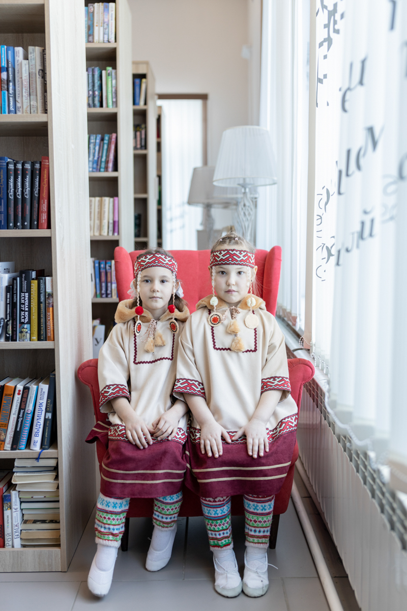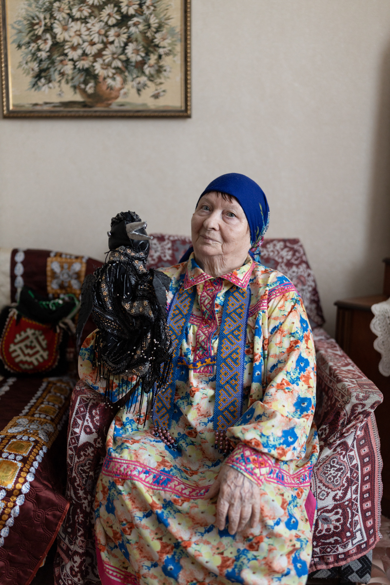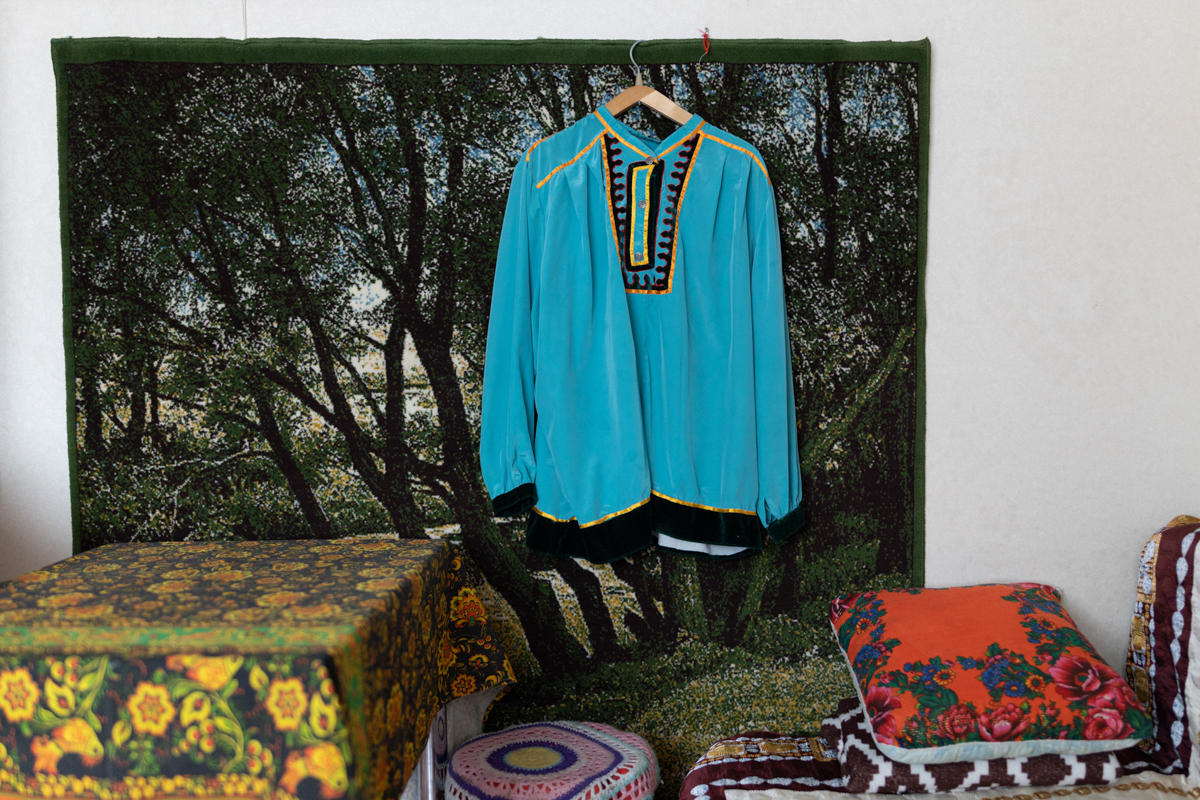 В коридоре квартиры стоят стеллажи с вышитыми вручную картинами. Каждая — на сюжет мансийской сказки. Шьет Нина Георгиевна и платья, относится к этому очень серьезно: «Одежда рассказывает о человеке, который ее носит. Манси по платью могут узнать друг друга. Оно говорит, с какой территории человек, и помогает понять, кто он — бабушка, тетя, невеста».