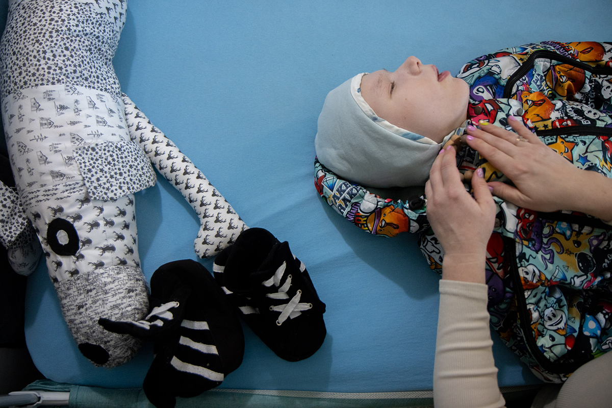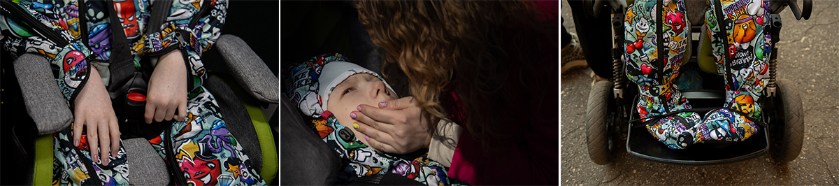 «У меня уже тогда была идея обшивать Колю. Началось с нагрудников. Когда мы ездили на лечение в Польшу, я увидела там яркие, красивые нагрудники на детях с инвалидностью — они выглядели нарядно. У нас же мамы обматывали ребенка старыми полотенцами. Ребенок смотрелся убого, это вызывало жалость, а то и брезгливость. Так я начала шить нагрудники — вначале своему сыну, а потом и знакомым».