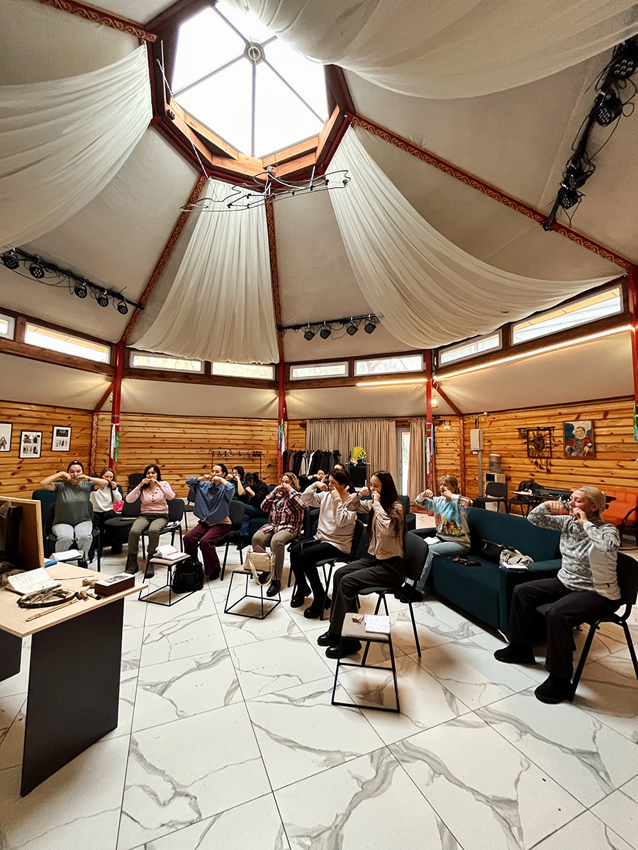 Прошлой осенью я решила вести регулярные занятия по игре на тимiр-хомысе. Нашла помещение, которое идеально подошло для уроков, — юрту хакасского национального театра «Читiген». Юрта большая, светлая, украшенная разноцветными лентами. В ней пахнет деревом, а на стенах висят хакасские инструменты. Так появилась школа «Ойын». «Ойын» по-хакасски «игра» (как на инструменте, так и во что-то). Мне нравится этот двойной смысл — ведь мы играем для себя, для удовольствия и относимся к изучению приемов не как к экзамену, а как к увлекательной игре. Каждое занятие начинаем с дыхательных техник, упражнений на улучшение артикуляции, осваиваем голосовые имитации и, конечно, играем на инструменте. В школе занимаются люди разных возрастов и профессий: сидят в юрте и учителя, и экономисты, и гиды, и предприниматели, студенты и пенсионеры — все такие разные и серьезные. Но когда у них получается изобразить топот лошадиных копыт или крик кукушки, все радуются одинаково.