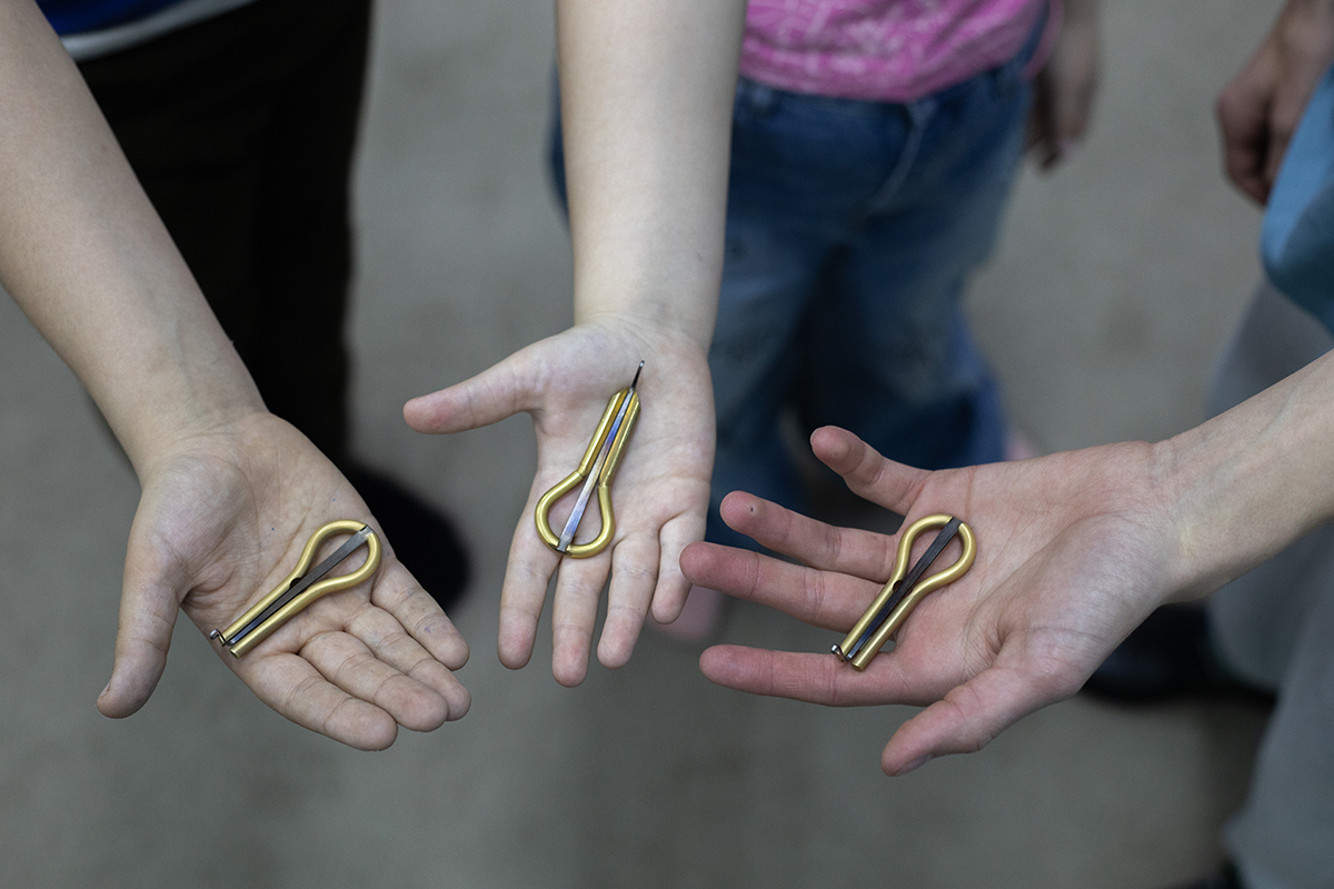 Надо признаться, тут возникли сложности. Но так происходит у большинства начинающих: инструмент хоть и выглядит просто, имеет особенности. Чтобы тимiр-хомыс запел, его нужно плотно прижать к зубам так, чтобы металлический язычок свободно проходил между ними. Не закусить, а именно прижать. Губы мы держим в тонусе (если губы расслаблены, они могут защемиться между язычком и боковой гранью тимiр-хомыса). К тому же нужно следить за рукой, наносящей удары по язычку. Словом, много нюансов, которые поначалу трудно удержать в голове. Конечно, у них не получилось сразу. Реагировали по-разному: кто-то упорно продолжал, а кто-то начинал раздражаться. Впрочем, родители ребят все время были рядом с ними и помогали как могли.