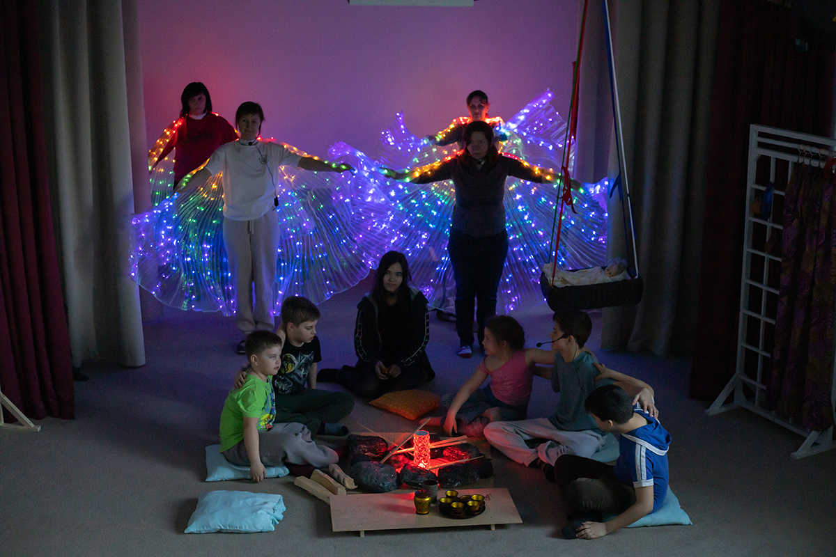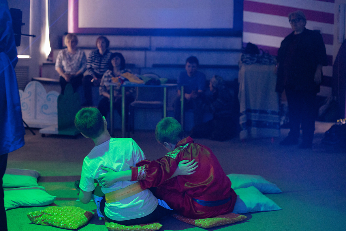 Каждую субботу в театр приходят 10 семей — на репетиции, которые ведет Елена Клепинина. Она рассказала мне, что долго искала человека, который мог бы заняться театром, но так и не нашла и в итоге сама выучилась на тьютора и прошла программу для педагогов в Театральном институте им. Щукина. Так что Елена теперь еще и режиссер и сценарист. Спектакль, для которого я обучала детей-актеров играть на тимiр-хомысе, придумала она сама. Пьеса называется «Кормление огня».