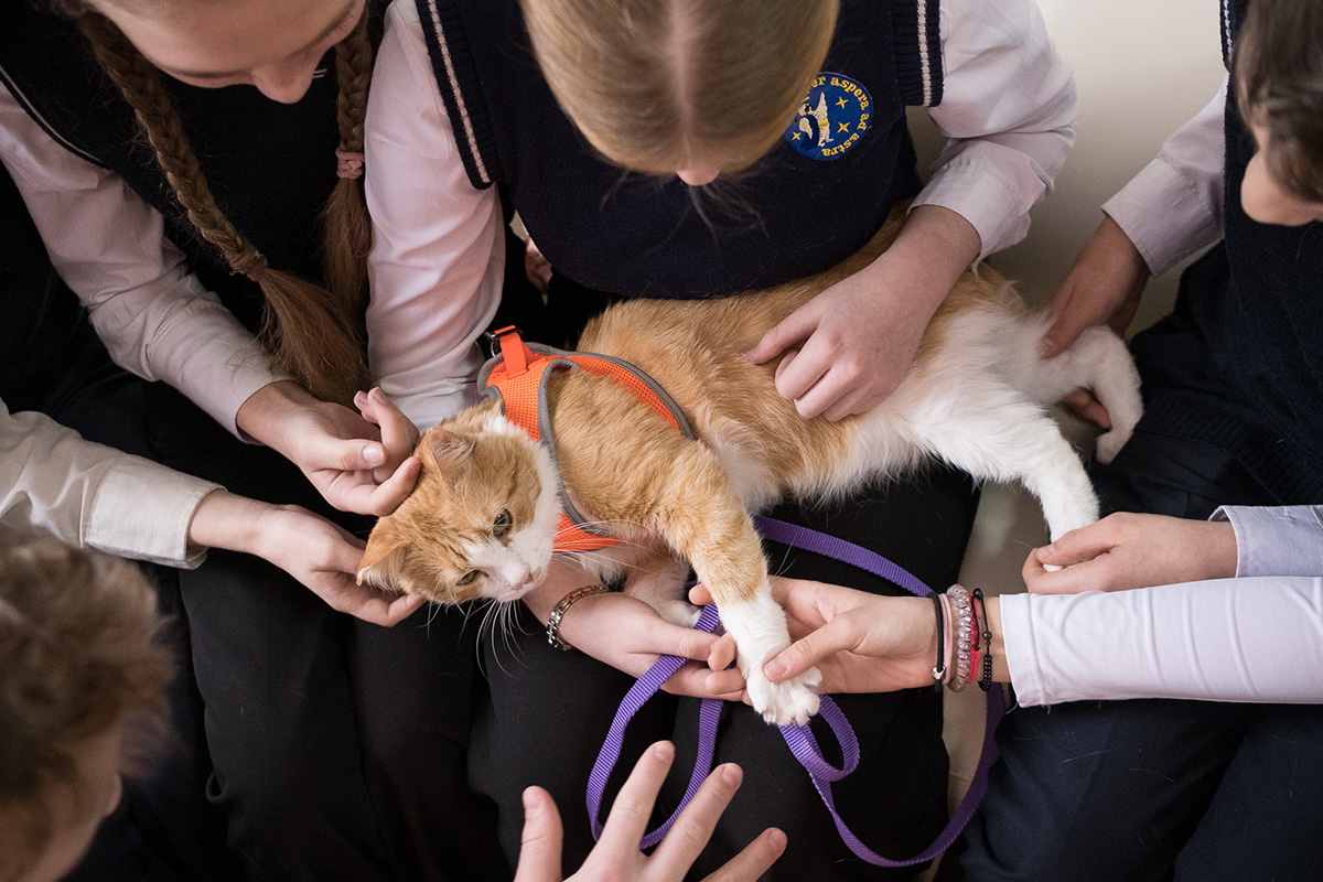 «Характер у него боевой, — представляет Рыжика Екатерина, секретарь директора школы и второй куратор проекта. В это время Рыжик без стеснения запрыгивает на рабочий стол и настойчиво требует от окружающих ласки и внимания. — Когда он жил на улице, гонял других котов и даже собак, постоянно со всеми дрался. Я помню, когда мы его первый раз взяли на передержку после лечения у ветеринара, я его погладила по голове — и кусочек уха просто остался у меня в руке. Это было его боевое ранение».