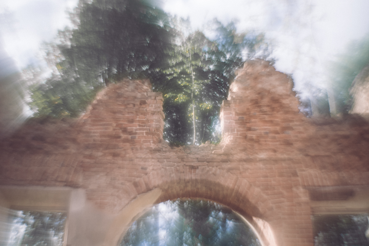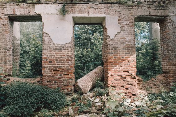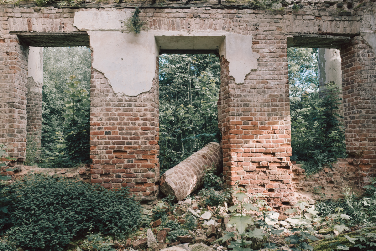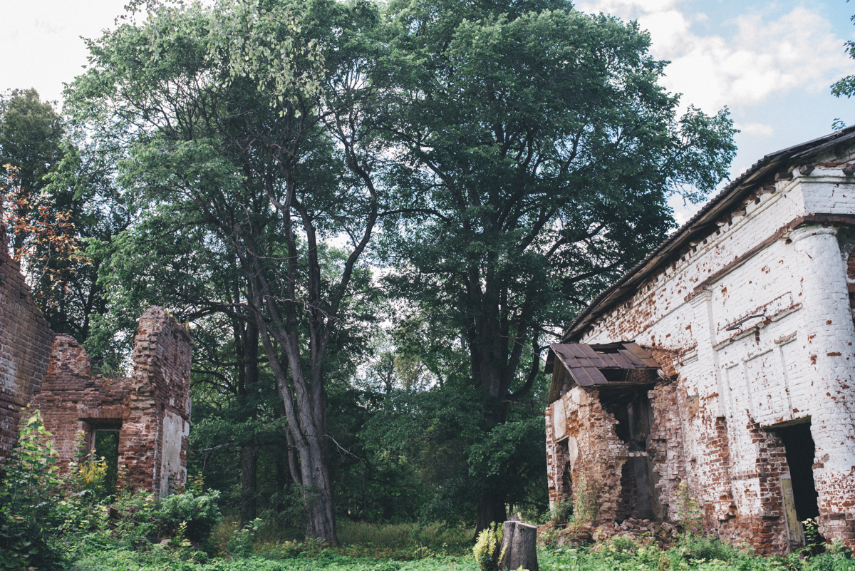 Вместе с волонтерами мы приехали в усадьбу в тихий солнечный день. В воздухе отчетливо тянет дымком и копченой рыбой. Безлюдно. Накатанная дорога, больше похожая на лесную просеку, ведет прямо к руинам былого величия. В здании уцелели колонны, когда-то поддерживавшие классический портик и один из флигелей, а по остаткам стен все еще угадывается абрис большого усадебного дома.