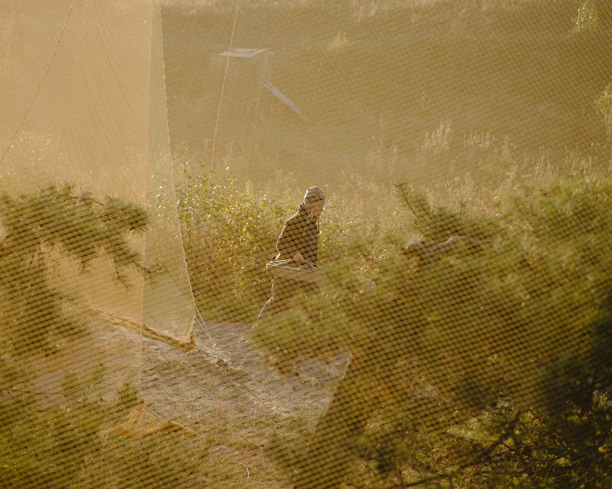 Ближе к дюнам установлена ловушка — огромная воронка расставленных рыболовных сетей. Птицы залетают внутрь и оказываются в «комнатке», где их и собирают ученые для кольцевания. Весной еще одну такую же ловушку ставят в обратном направлении.