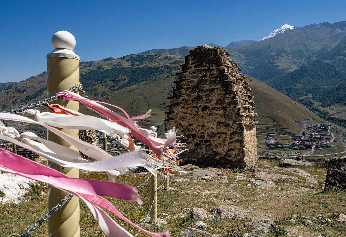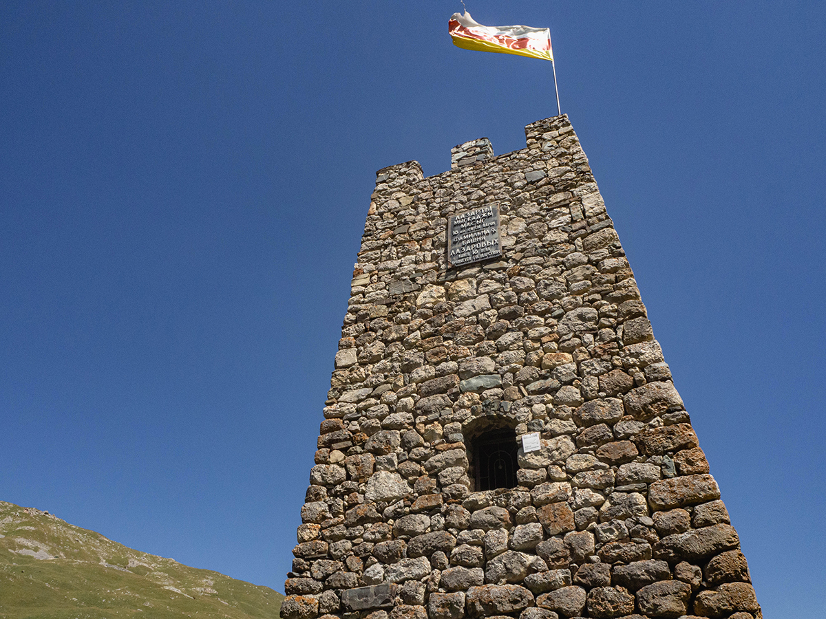 Если проехать дальше по Куртатинскому ущелью, а потом подняться по пыльному серпантину где-то до двух тысяч метров над уровнем моря, можно обнаружить заросшие развалины еще одного старого селения — Нижнего Кора. Но, как и в случае с Цмити, здесь уже есть точка возрождения. Родовая башня и место силы еще одной осетинской фамилии — Лазаровых.