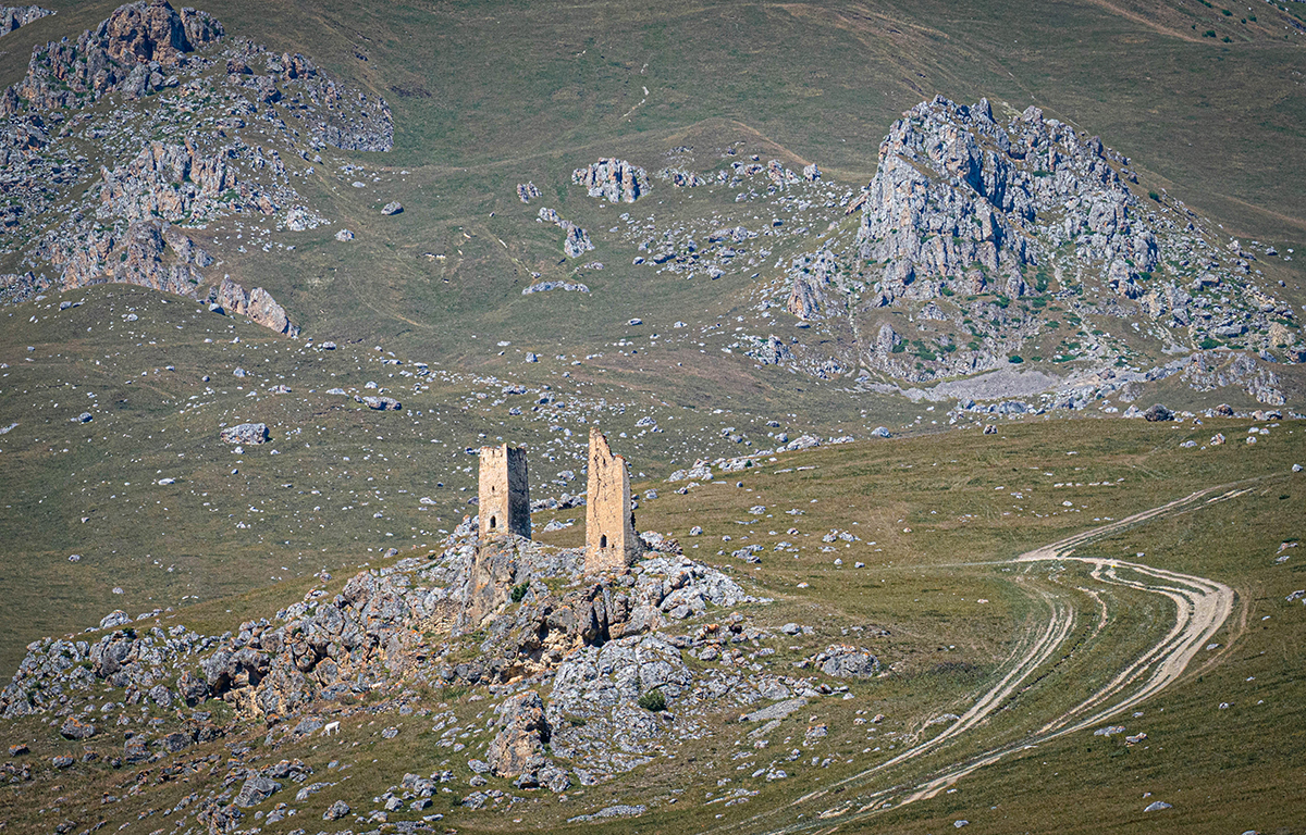 Высоко на склоне видны две сигнальные башни. В отличие от родовых башен в селениях, которые не щадило ни время, ни люди, они сохранились куда лучше. Алан объясняет, что это лишь видимая часть огромного комплекса, несколько уровней которого скрыто в глубине скальной породы.