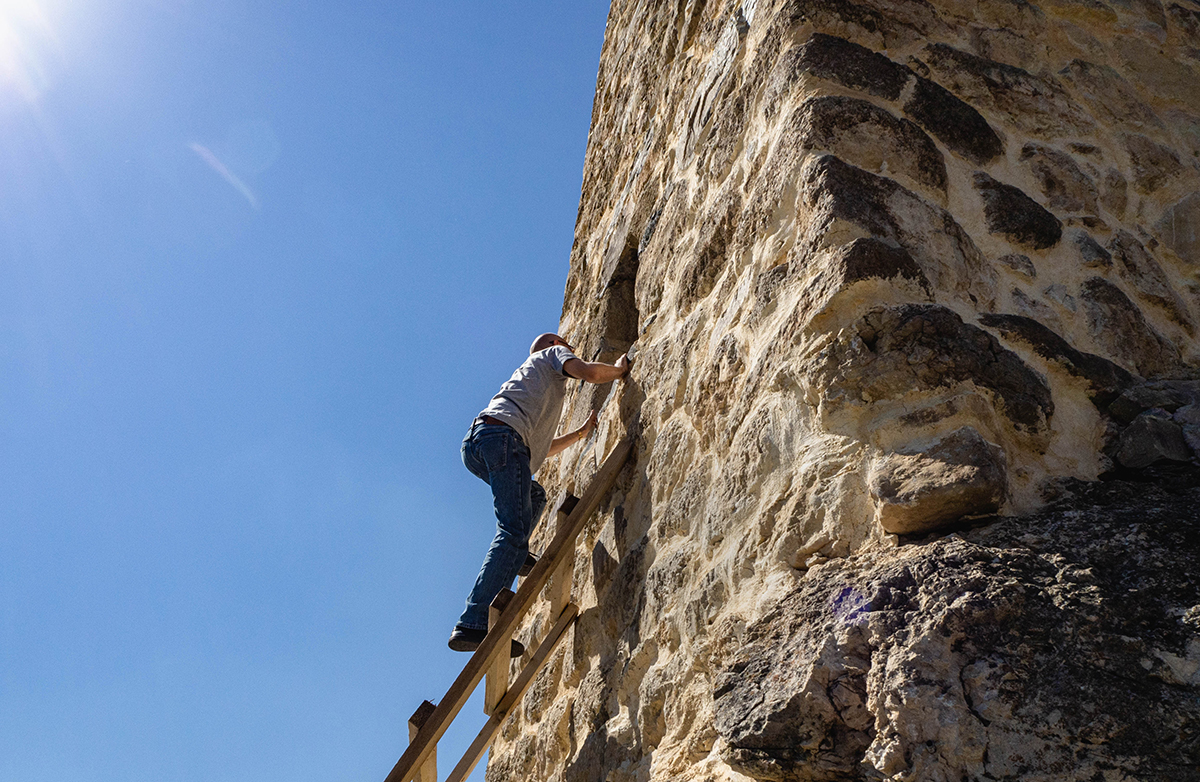 Мы стоим у одной из таких башен. Снаружи она уже обрела свой первозданный облик, и только светлый цвет раствора между камнями выдает следы недавней реконструкции. Через пару лет раствор потемнеет, и кладку будет не отличить от оригинальной.