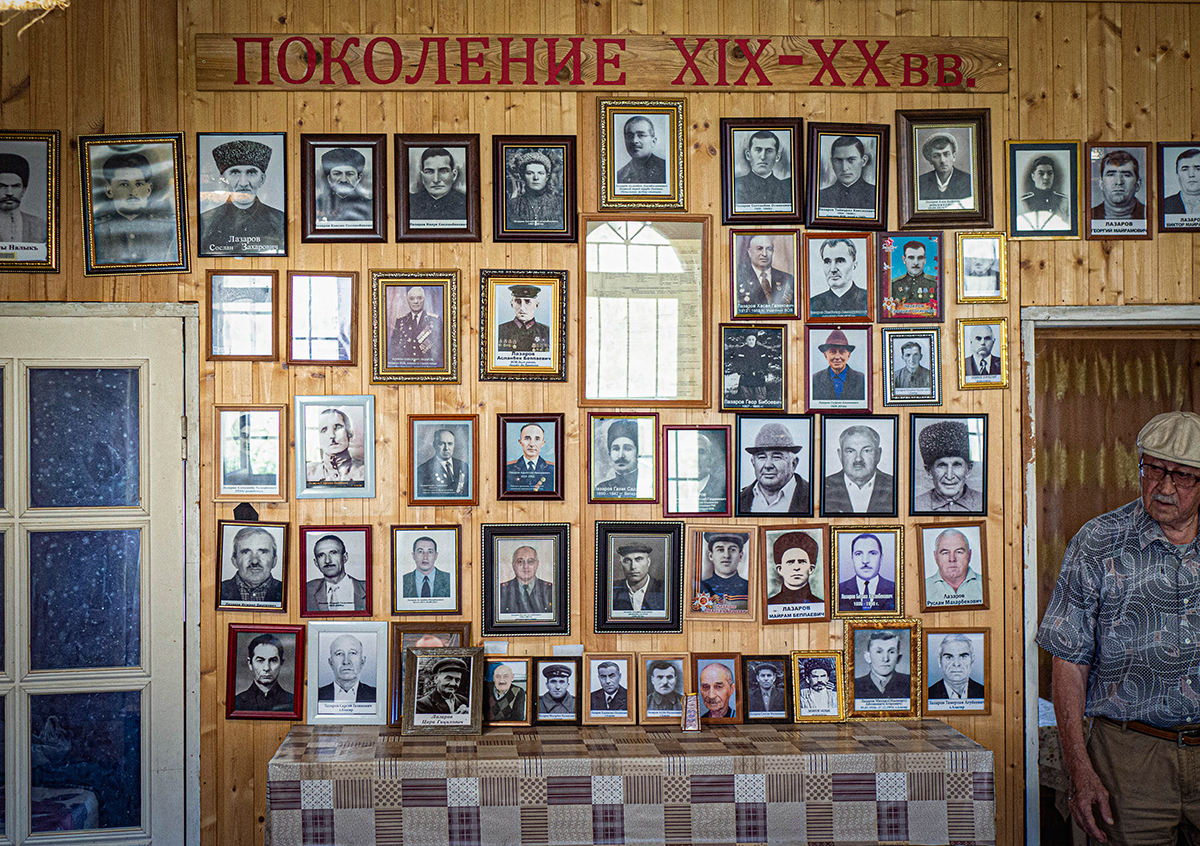 «Вот мой отец, который без вести пропал в 1943 году. А вот этот погиб в Украине, двое детей у него осталось. А это наш герой труда», — Амурхан показывает мне фотографии, которые занимают большую часть свободного пространства на стенах главной комнаты. Тут поколения Лазаровых за три века. Все снимки, которые удалось найти по домашним архивам.
