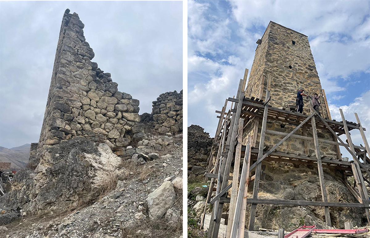 Борис рассказывает, что разрушенная, как и большинство древних сооружений в ущелье, во время карательной экспедиции 1830 года, их башня была восстановлена одной из первых в республике. Работы здесь начались в 2011 году. Стройка продолжалась около шести лет, из них два-три года ушло на восстановление башни. Все делали самостоятельно, не претендуя на гранты, не привлекая специалистов. Вовлечено в процесс было около 60 человек, остальные помогали деньгами. «Государство нам ничего не давало, а мы и не просили. Так даже лучше. Потому что мы так друг друга узнаем».