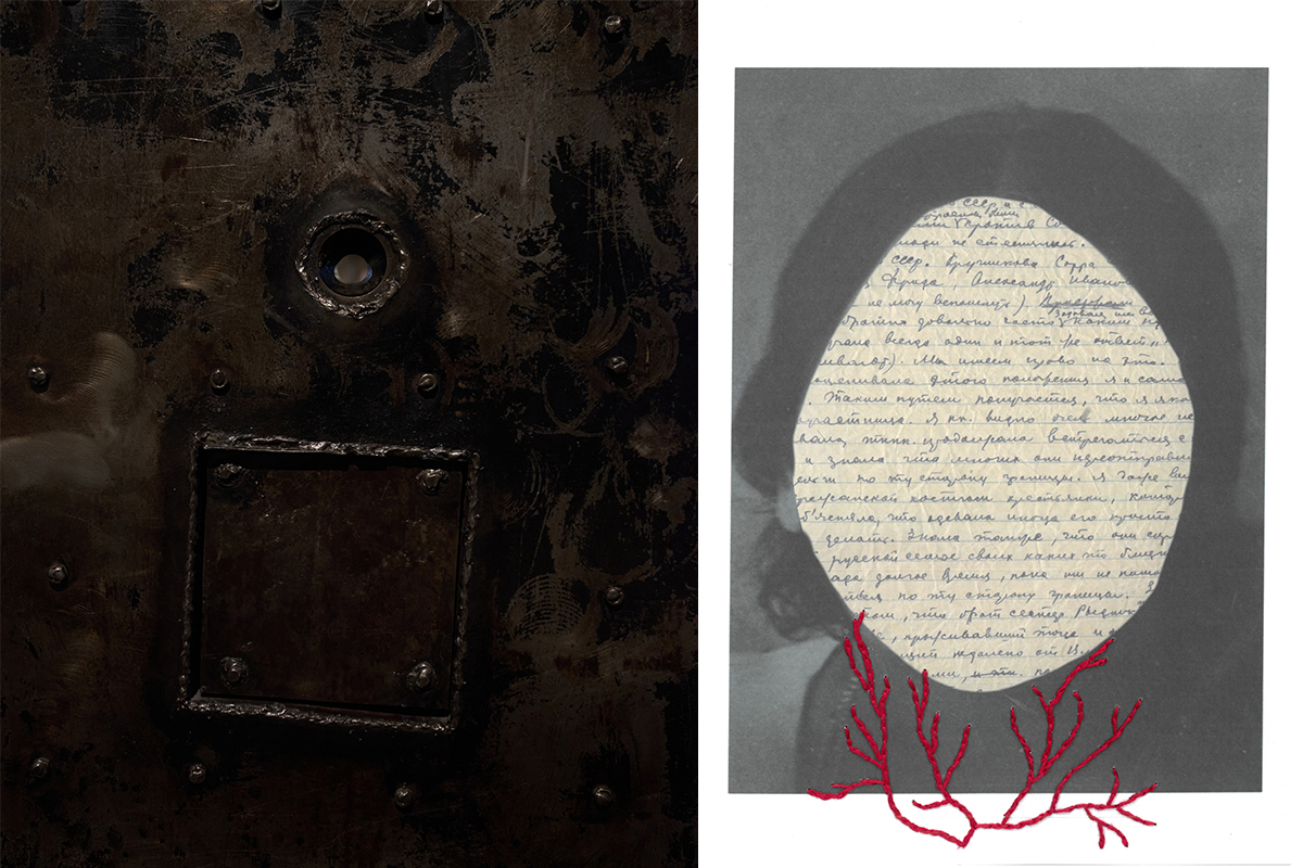Слева: двери тюрьмы — то, что заключенные видели и слышали ежедневно: скрип, скрежет, резкие удары кулаком. Справа: коллаж с использованием портрета прабабушки и написанного ее рукой заявления, найденного в следственном деле. Сверху красными нитками вышит узор, исходящий от ее груди. При аресте человека его близкие не знали, что с ним происходит, а в свидетельствах о смерти указывались ложные причины и даты. Большинство смертей в лагерях или при расстрелах оформляли как «пневмонию»