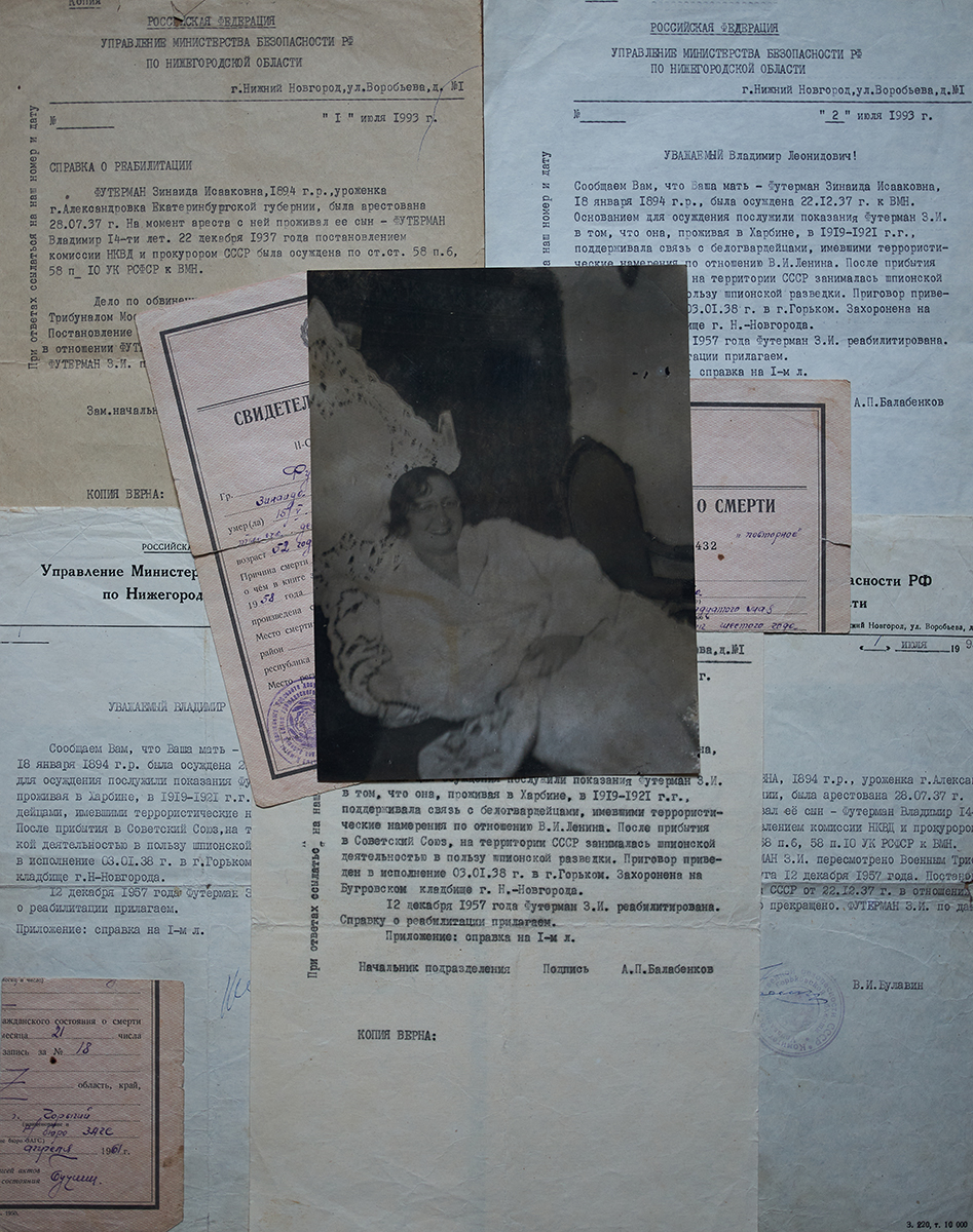 Портрет прабабушки расположен поверх свидетельства о смерти и справок о реабилитации