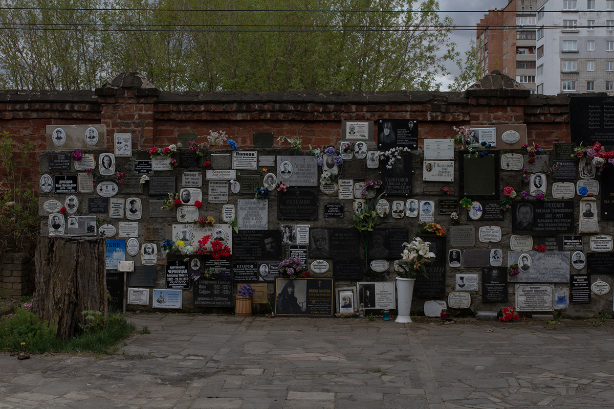 Изучая город и места, где она жила, я нашла историческое здание Тобольских казарм — то самое место, откуда ее забрали энкавэдэшники. Потом я отправилась на Бугровское кладбище, где она захоронена вместе с другими расстрелянными. Я нашла мемориал, посвященный жертвам Большого террора. На кирпичном заборе, окружающем кладбище, размещены их фотографии и даты жизни и смерти.