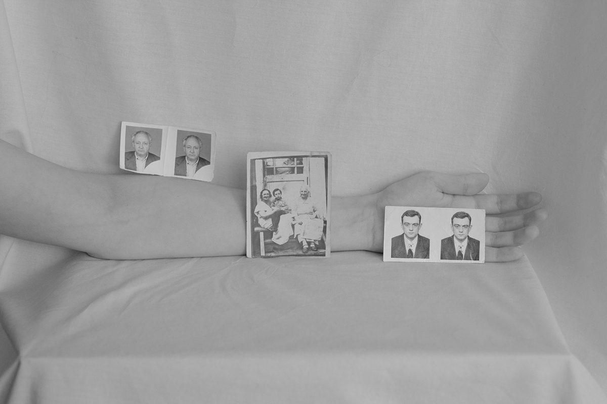 На этом коллаже изображены три паспортные фотографии — моя, моего отца и дедушки, — в которые вшит портрет Зинаиды Исааковны. История ее последних месяцев и смерти живет в нас и заставляет смотреть на многое через ее опыт