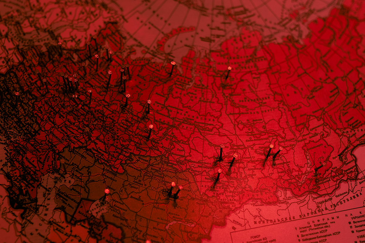 На карту ГУЛАГа вбиты гвозди в местах, где были расположены лагеря