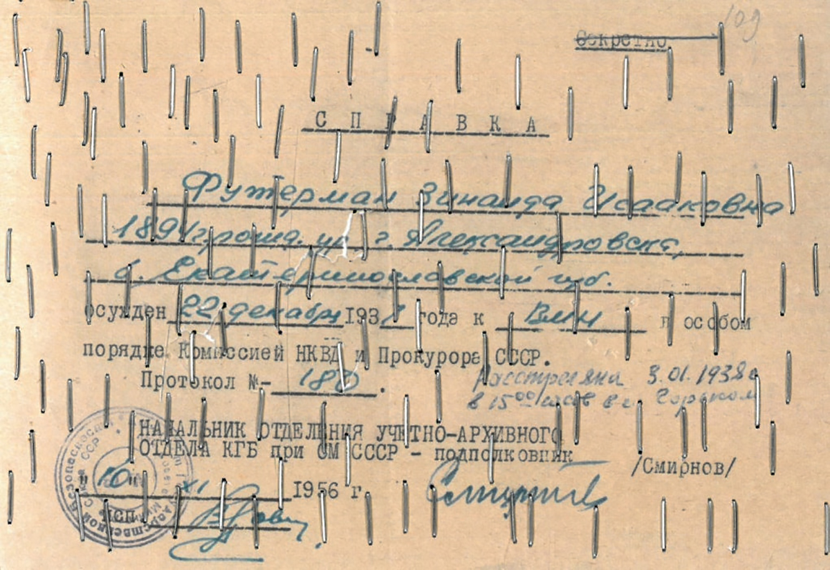 26 ноября 1937 года сержант государственной безопасности Березников постановил направить следственное дело № 10832 Футерман З. И. на внесудебное рассмотрение. В рассекреченной справке указано, что 22 декабря 1937 года комиссией НКВД и прокурором СССР прабабушка была приговорена к высшей мере наказания в особом порядке, а сбоку ручкой дополнено: «Расстреляна 3.01.1938 г. в 15:00 часов в г. Горьком».