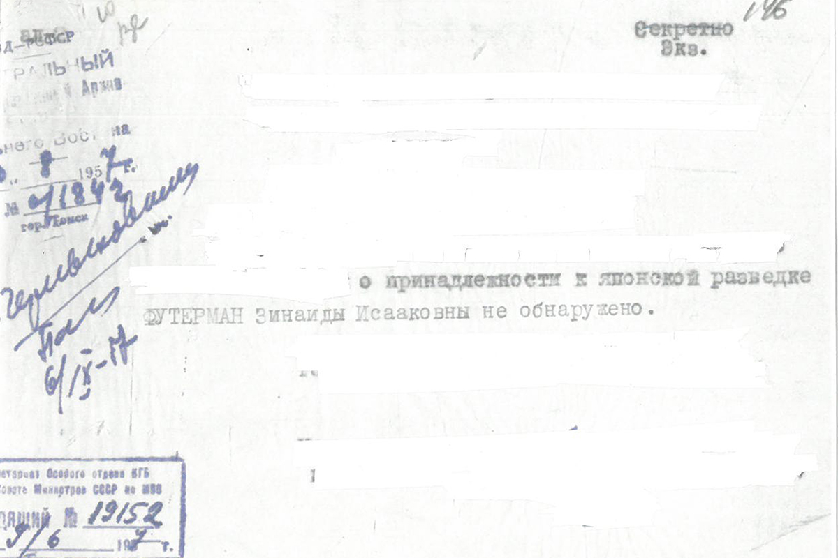 Во время реабилитации Зинаиды Исааковны проводился пересмотр дела, после чего ее связь с японской разведкой не была обнаружена