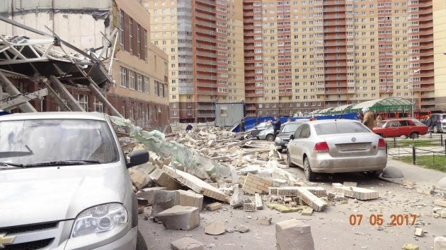 «Сложились внутренние стенки, упали на припаркованные машины и на помещение с охранниками», — рассказал один из очевидцев произошедшего.