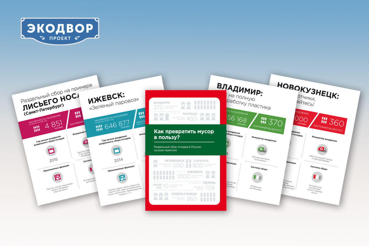 Проект «Экодвор» выпустил пособие «Как превратить мусор в пользу?» о наиболее успешных практиках раздельного сбора бытовых отходов в городах России. Сборник предназначен в первую очередь для чиновников, которые хотели бы внедрить данную систему.