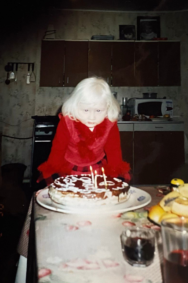 У 21-летней Дианы из Казани волосы почти белые: когда она была ребенком, ее родителей упрекали, что они якобы осветляют волосы такой маленькой девочке. Еще у Дианы почти прозрачные брови — чтобы скрыть это, в подростковом возрасте она красила их в темный цвет. Светло-голубые глаза кажутся очень большими: девушка носит очки с толстыми линзами.
