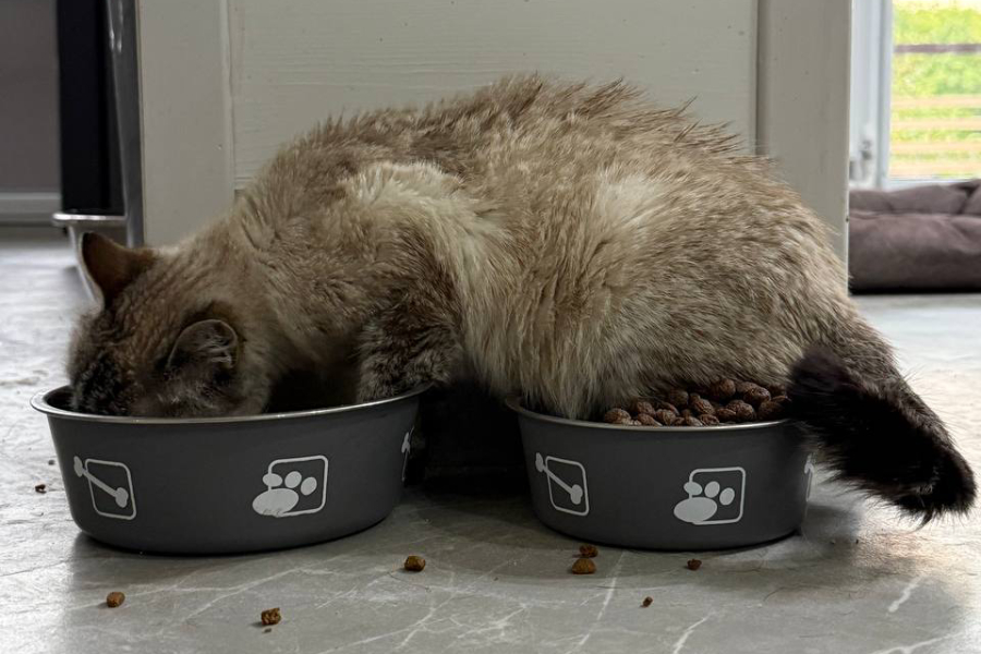 Еще кошка очень долго ест: тыкается в миску закрытым ртом, будто забывает, что его нужно открывать. Шанти часто падает с высоких поверхностей и спотыкается о миски, а лоток использует не только как туалет, но и как место отдыха.
